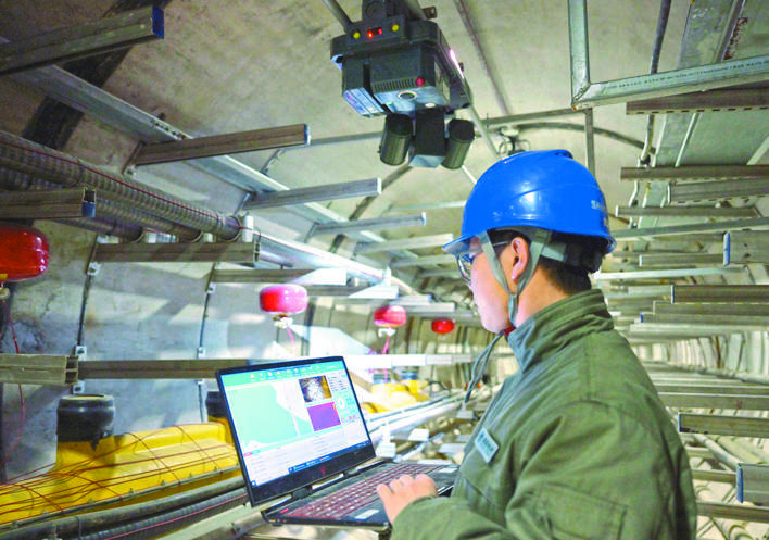 国网合肥供电公司电缆运检中心工作人员在巢湖湖底电缆隧道内调试“机器人巡检员”。 周牧 摄