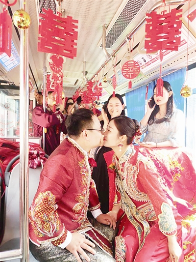 “用豪车作为婚车是当下普遍的做法,而今天我们选择用公交车接亲,这样做既可以避免攀比浪费,又做到了绿色出行,更重要的是亲朋好友都能坐在一起,热热闹闹,有说有笑,温馨而浪漫。”新郎卢先生介绍,新娘王女士也非常喜欢这样充满仪式感的接亲方式。