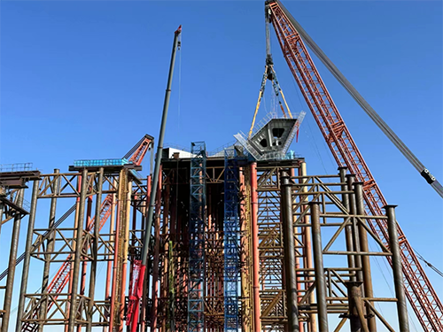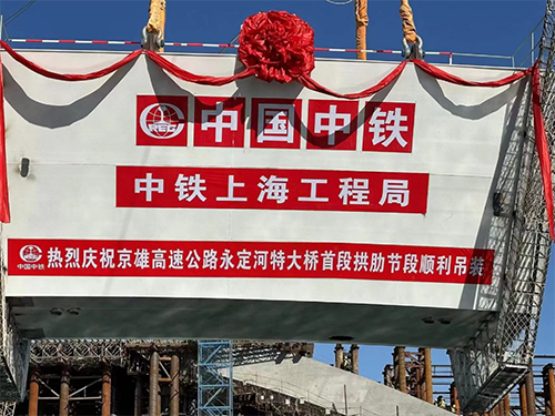 中铁上海工程局京雄高速公路项目一分部总工介绍,永定河特大桥共有拱肋节段42个,南北两岸各21个。因梁场位于南岸,所以率先在南岸对首段拱肋进行吊装。此次吊装的首段拱肋节段,长13.54米,重达134.3吨,相当于近百辆小轿车重量。接下来,施工方将用超大“蜈蚣车”(单台24个轮子的液压模块车),将21个拱肋节段运送到北岸,届时,两岸将同步进行拱肋节段吊装施工。