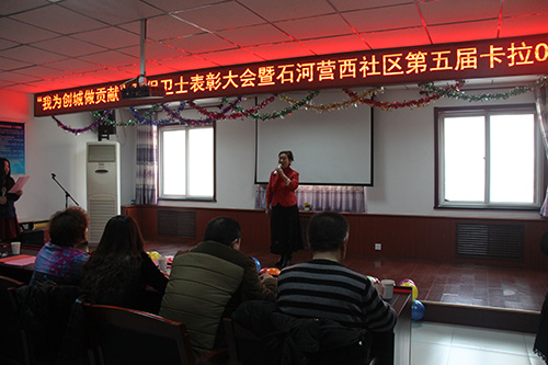 1月22日,延庆区香水园街道石河营西社区举办“我为创城做贡献环保卫士表彰大会暨第五届卡拉OK大赛”在创建全国文明城区工作推进中,社区环境面貌得到了整体提升,涌现出很多优秀环保工作者,社区对优秀环保卫士进行表彰,发放了环保垃圾袋,树立典型,号召大家要以先进为榜样,为创建全国文明城区做出更大的贡献。表彰大会后,组织社区24名居民举办卡拉OK大赛,其中年龄最大的62岁,最小的仅12岁,不同年龄段的参赛选手同台比拼,同声欢唱。最后,社区居民马胜利凭借《延庆可爱的家乡》荣获一等奖。