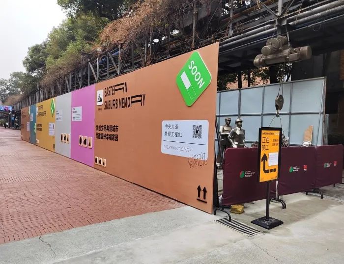 在东郊记忆西大门的门口处,施工人员正在修补路面,破损路面周围用橙色临时隔离栏围住,既符合施工规范又醒目。园区核心干道中央大道也在进行着景观工程的提升,施工打围的外立面喷绘了充满创意的文字和图画,与整个东郊记忆的风格一致,看上去既清爽整洁又赏心悦目。