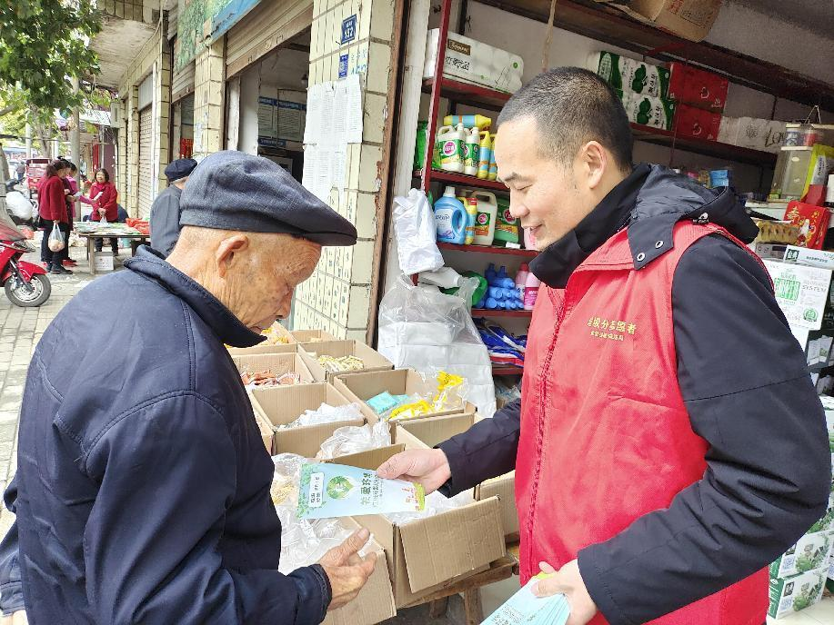 宣传过程中,志愿者向商户分发垃圾分类宣传资料,耐心讲解垃圾分类相关政策和知识,解答商户提出的在日常垃圾分类时遇到的各类问题,倡议商户主动担负起垃圾分类主体责任。