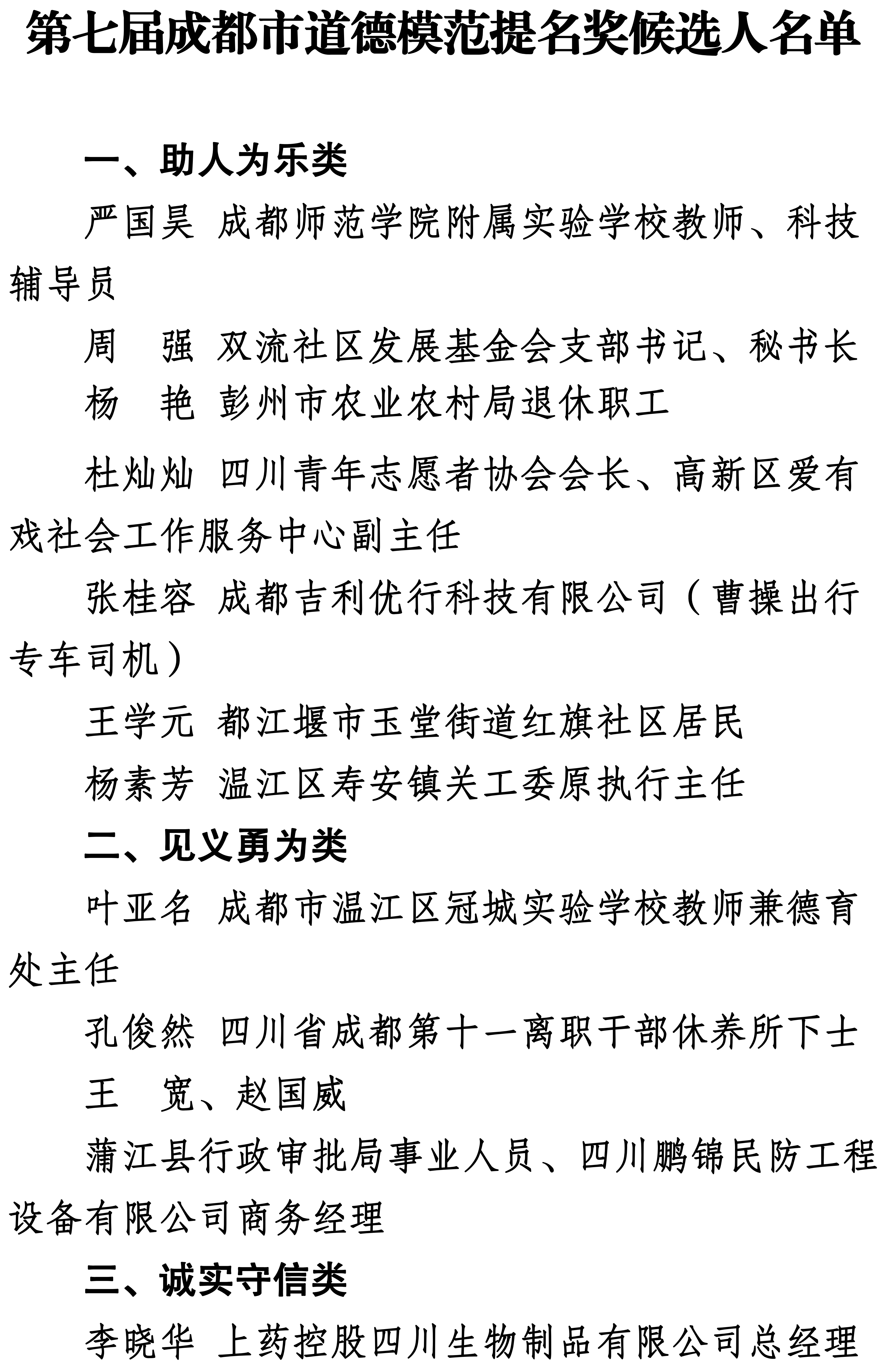 由市委宣传部(市文明办)、市委政法委、成都警备区政治工作处、市总工会、团市委、市妇联等单位联合主办的第七届成都市道德模范评选活动于今年1月正式启动。日前,经过专家评审,从457名候选人推荐材料中,评选出了50名第七届成都市道德模范候选人、27名第七届成都市道德模范提名奖候选人。5月26日至6月1日,第七届成都市道德模范及提名奖候选人名单将进行为期5个工作日的公示。欢迎社会各界进行监督,如有意见建议,可于6月1日前来电来邮等方式向市文明办反映。