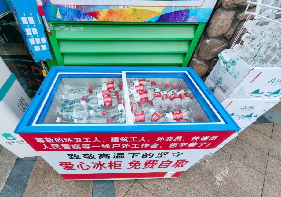 在捐赠者许政川看来,户外工作者们工作时间长、工作量大,酷热又给他们的工作增加了难度,“他们路过‘爱心冰柜’前,就可以来拿一瓶冰水喝。”他还介绍,这些矿泉水的温度被控制在15摄氏度左右,喝起来很凉爽,又不会对身体造成刺激。
