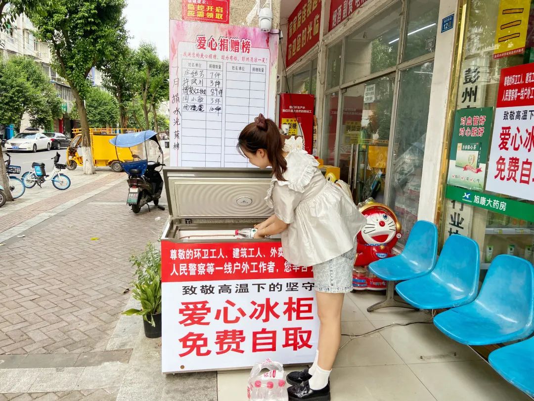 在彭州盛世天彭小区西1门旁旭康大药房门前,一台崭新的“爱心冰柜”吸引众多市民的注意,柜身上“爱心冰柜免费自取”“致敬高温下的坚守”等字样格外抢眼。每天下午,外卖员小张都会到“爱心冰柜”里拿一瓶冰镇矿泉水解渴。他说:“设立‘爱心冰柜’这个举措很用心,这么热的天能在这里拿到免费的水喝,很方便,也很解渴。”
