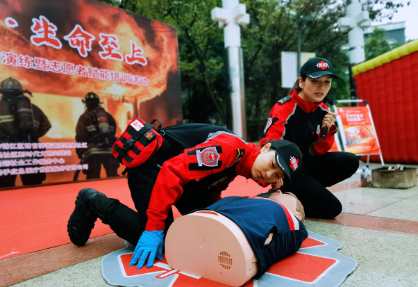 来自成都地铁的工作人员向居民讲解地铁消防安全常识及地铁遇到火灾等突发事件的逃生要领,来自携手应急医疗救援服务的老师为大家普及消防基础知识及各类消防器材的使用方法,并在现场演示了心肺复苏、AED、烧烫伤等急救处置的操作要领。
