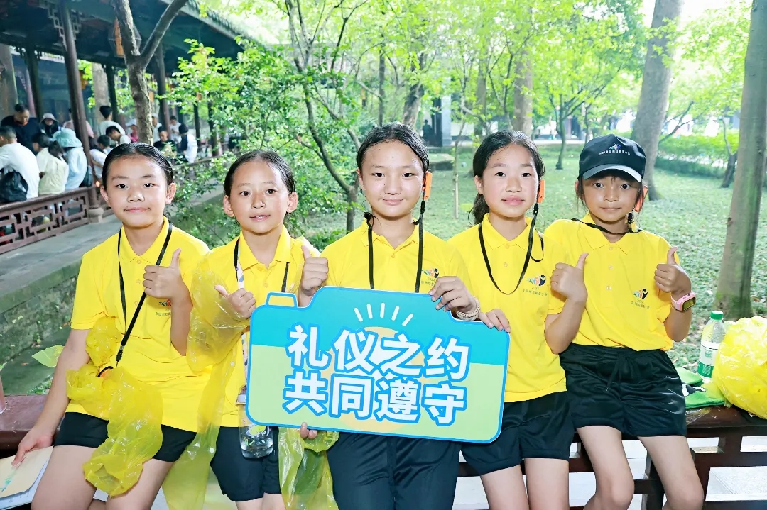 雨中休息的片刻,小游客们有的安静倾听讲解,有的蹲在地面记笔记。雨后,将垃圾收拾好,扔进垃圾桶内,一个个文明礼仪的细节正根植于他们的内心深处。
