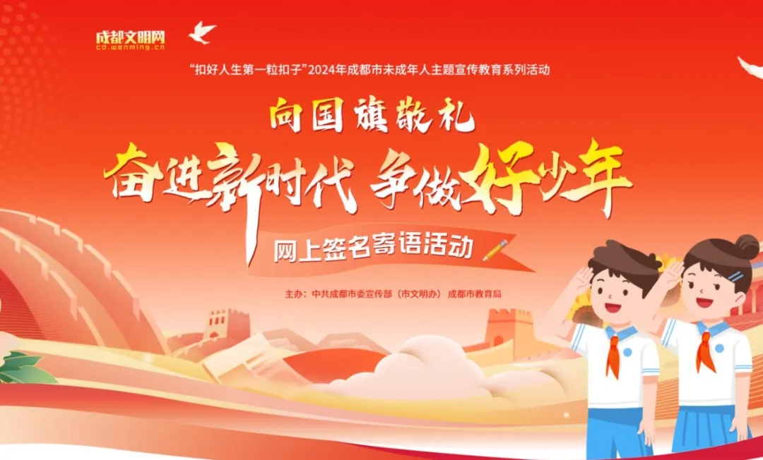 9月27日至10月7日,成都市委宣传部(市文明办)、成都市教育局联合开展“扣好人生第一粒扣子”2024年成都市未成年人主题宣传教育系列活动——「向国旗敬礼」网上签名寄语活动。5万余名中小学生积极参与,以最热烈的告白向祖国母亲献上深深祝福。