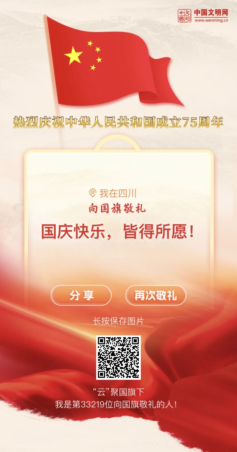 置身祖国浩荡向前的时代进程中,人人都是“护旗手”。国庆节当天,中国文明网、成都文明网联合推出“2024向国旗敬礼”网络文明传播活动,邀请全国网友一起向国旗敬礼,祝福祖国母亲生日快乐。
