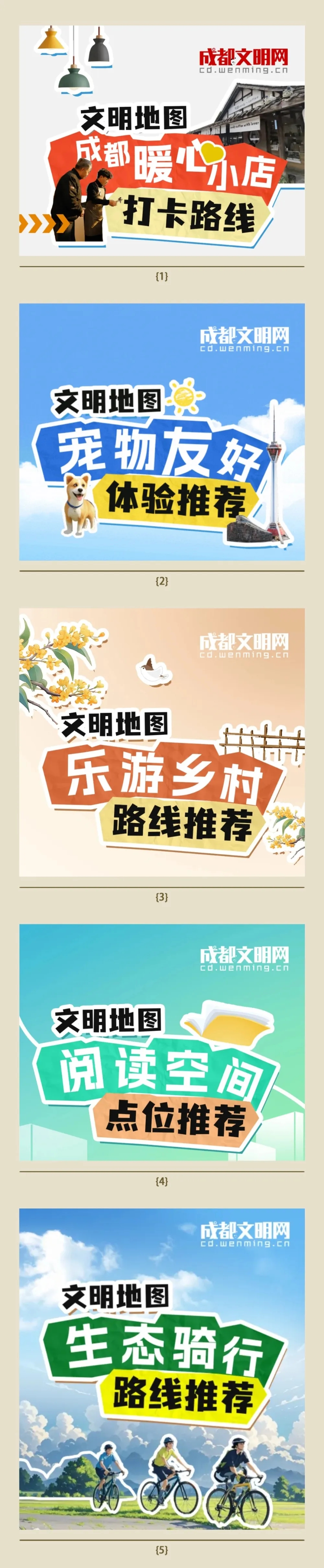 这个国庆假期,成都依然是国内最热门的旅游目的地之一。为助力市民游客畅游成都,“文明成都”微信公众号连续推出“文明地图”系列打卡线路,从暖心小店打卡路线、宠物友好体验推荐、阅读空间点位推荐、乐游乡村路线推荐、生态骑行路线五个方面,为市民游客推荐隐藏在烟火成都的温暖与触手可及的“诗和远方”,携手共赴文明之旅。