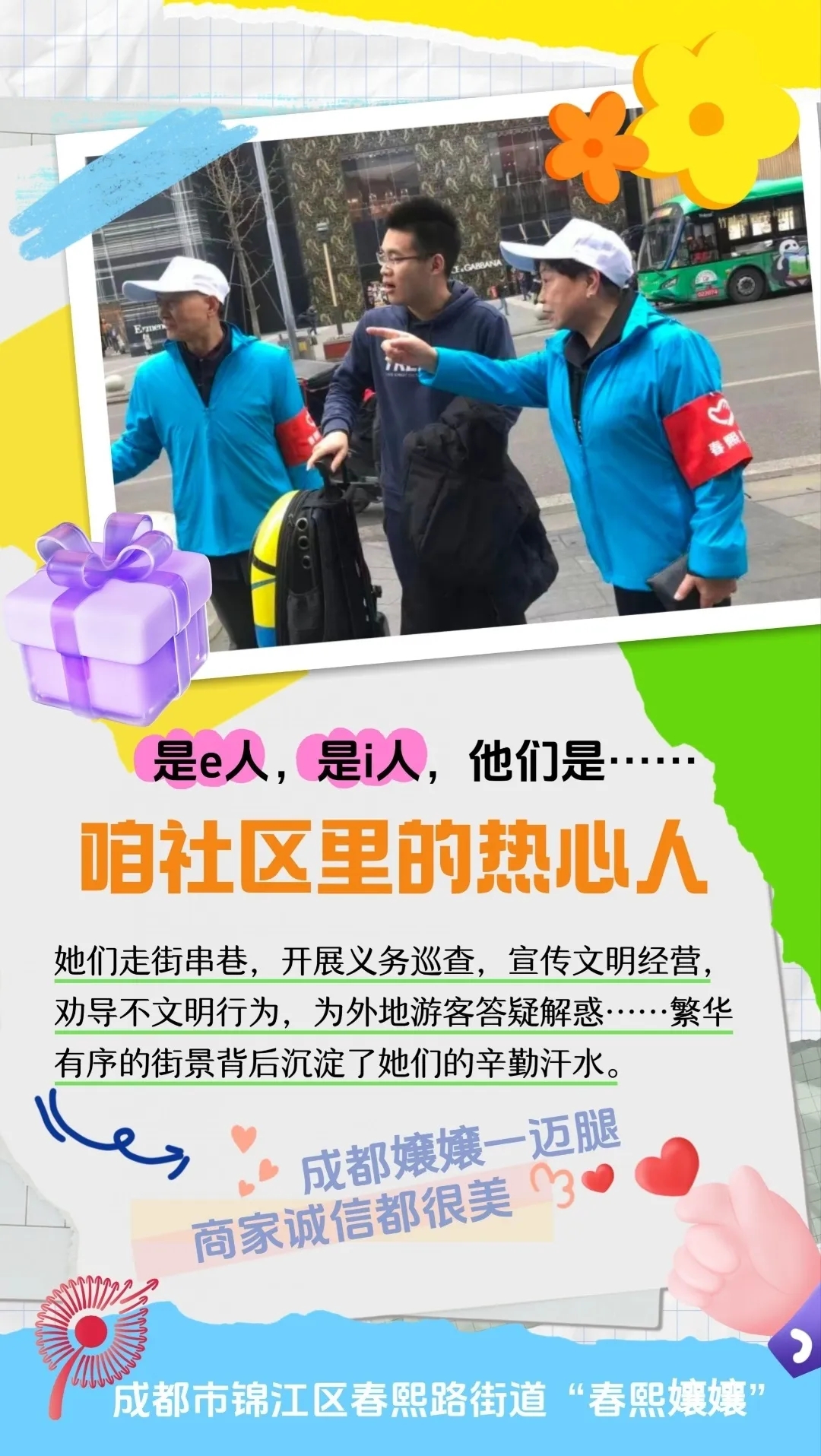 “有了他们在,我们觉得很贴心!”锦江区春熙路某商铺负责人告诉小锦,时常能看见“孃孃”们的身影,久而久之,附近的居民和商家都晓得,“‘孃孃’的劝导要听!”