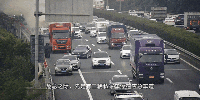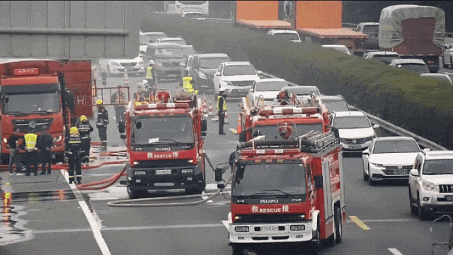 滚滚浓烟中,火势没有再蔓延,众人的努力为救援人员赢得了宝贵的时间——几分钟后,交警、119和120先后赶到现场,交警疏导并维护现场交通秩序,为119和120以及其他救援力量的顺利、快速到达疏通道路。灭火期间,交警持续疏导过往车辆,迅速通行,避免火情引发大面积拥堵。灭火后,协助高速环卫等部门,清理现场。
