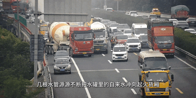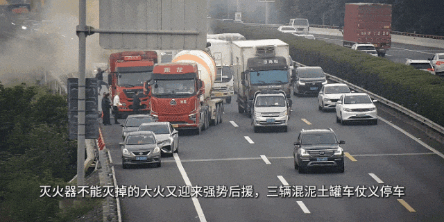 这个时候,“大家伙”来了。三辆刚刚在工地“下完料”的混凝土罐车“结伴而行”经过此地,见此情景,三辆罐车集体停车,司机陈志俊拿起车上的灭火器就冲了过来,一通喷射,火势依旧。三位罐车司机短暂商量后,开始“放大招”——三辆罐车呈“〉”型,将起火货车围在中间,每辆车水罐都携带有400升水,三管齐发,直冲货厢。