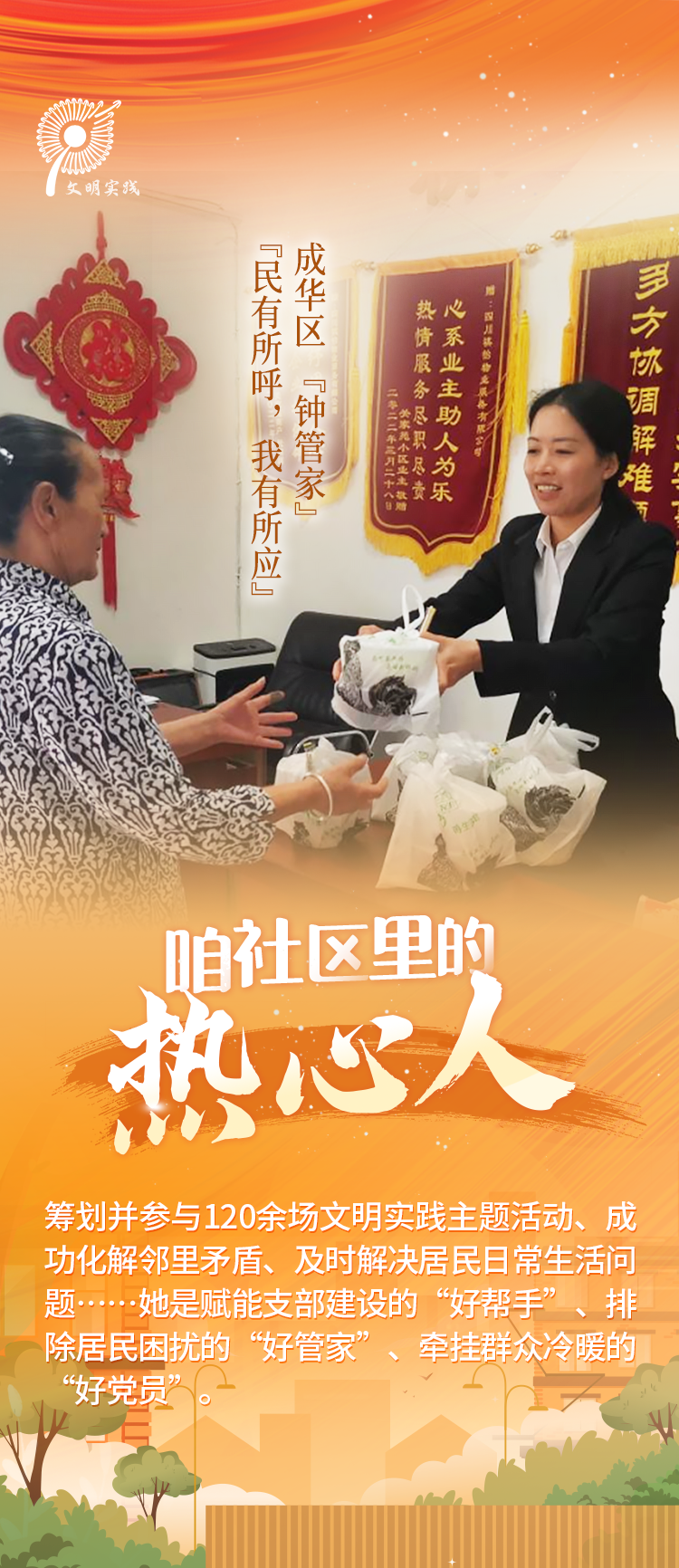 作为一名共产党员,她在日常工作生活中主动亮身份、树形象、做贡献,积极筹划并参与文明实践主题活动120余场,她的细心安排和热情组织,让同事和业主们深切感受到了“优秀党员就在身边”。
