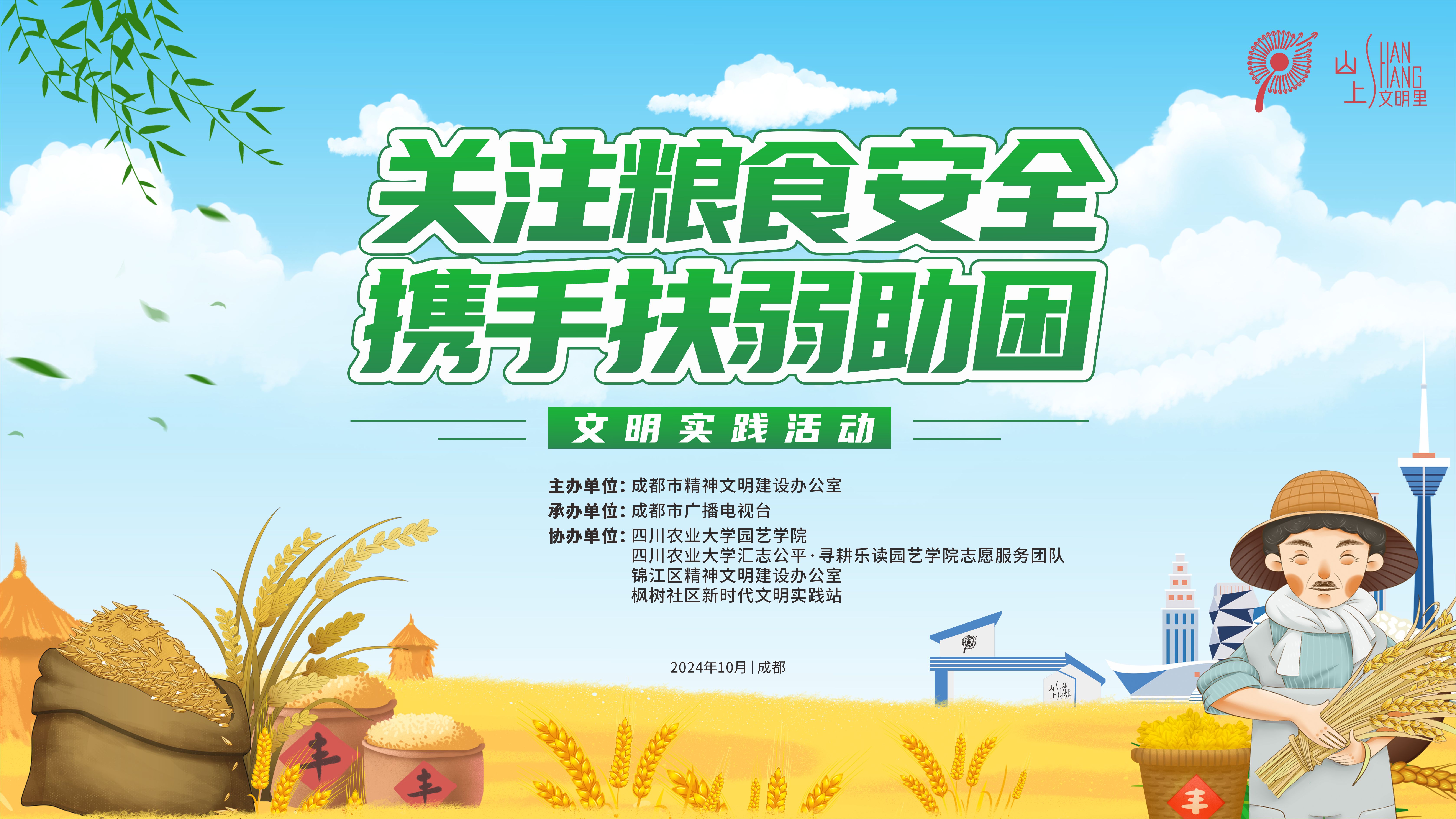 谁知盘中餐,粒粒皆辛苦。10月17日,以扶贫日、世界粮食日为契机,由成都市精神文明建设办公室主办、成都市广播电视台承办的“关注粮食安全 携手扶弱助困”文明实践主题活动在“山上·文明里”新时代文明实践公园暖心开展。