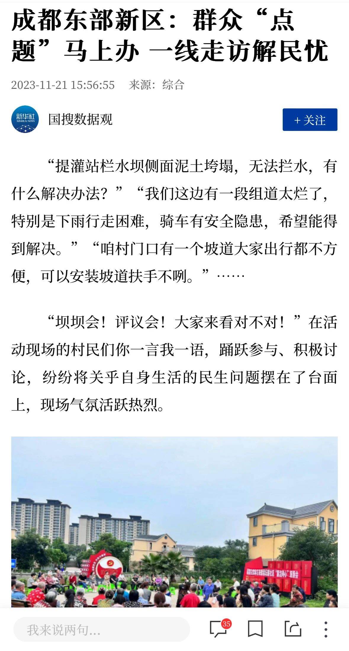11月21日,新华社发布《成都东部新区:群众“点题”马上办 一线走访解民忧》报道,关注成都东部新区基层治理相关情况。