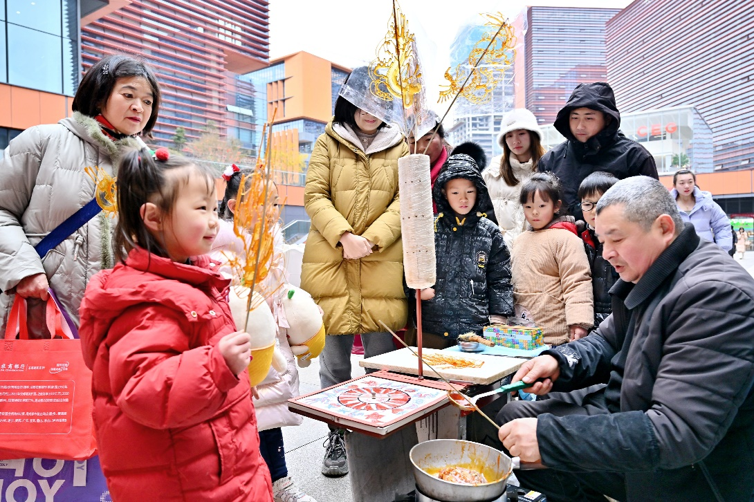 在西部金融创新中心党群服务中心,一系列热闹喜庆的新春节目纷纷上演,舞狮、川剧、战鼓、歌舞、朗诵、小品等演出类型应有尽有。年俗体验区更是人气爆棚,“写春联”“写福字”的活动体验深受大家喜爱,而“传统糖画”的魅力也吸引了众多居民前来围观排队。