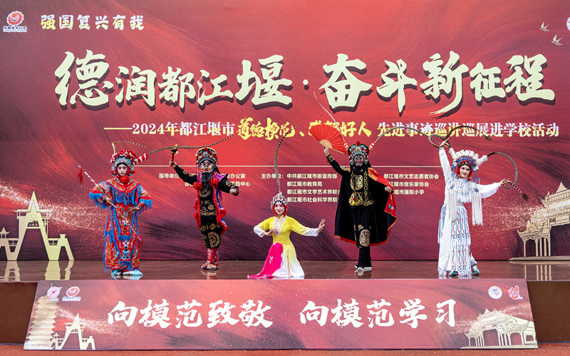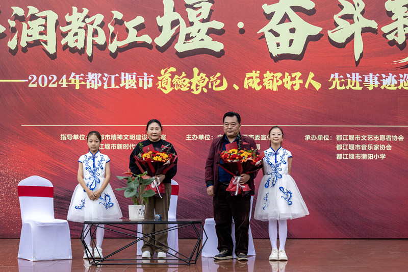 10月30日-31日,“德润都江堰·奋斗新征程”——2024年都江堰市道德模范、“成都好人”先进事迹巡讲巡展走进玉堂街道宝瓶社区和都江堰市蒲阳小学。现场邀请到2019年敬业奉献“中国好人”朱大海,2019年敬业奉献“四川好人”罗艳刚,2019年第五届成都市孝老爱亲道德模范陈容,2022年助人为乐“成都好人”、第七届都江堰市助人为乐道德模范董永杭,2023年助人为乐“成都好人”、第七届都江堰市助人为乐道德模范赵丽;2024年助人为乐“成都好人”郭云飞、黄大春等先进人物,宝瓶社区近50名居民和1800多名蒲阳小学师生参加活动。