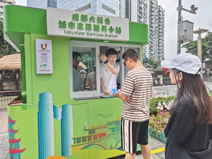 “服务小站以固定设施呈现,主要提供赛事宣传、城市推广、便民咨询三大类服务。”现场志愿者李芮说,城市志愿服务小站可以提供大运宣传、赛事咨询、便签纸笔、失物招领、应急药品、助残服务、免费饮水、应急充电、地铁出行引导等便捷化服务,各站点都由2—3名身着志愿服装的“小青椒”全天候为外来游客提供服务。