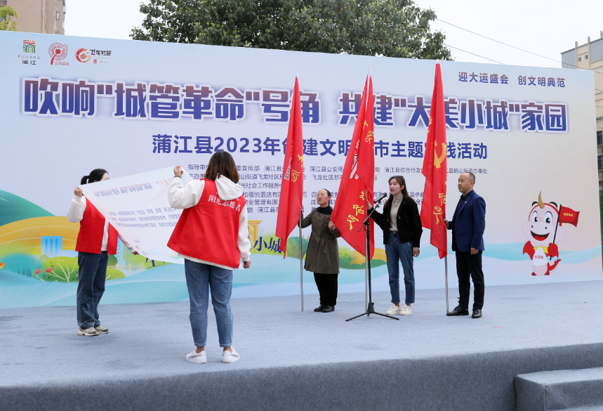 近日,蒲江县鹤山街道飞龙社区新时代文明实践站开展“吹响‘城管革命’号角·共建‘大美小城家园’”暨蒲江县2023年创建文明城市主题实践活动。活动吸引了社区共驻共建单位代表、志愿者队伍、社区居民等300余人参与。