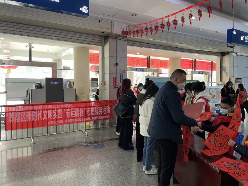 1月13日,成都市郫都区精神文明建设委员会办公室、郫都区团委、郫都区交通运输局联合郫都区志愿服务总队组织30余名志愿者在郫都区客运中心开展“春运暖程”志愿服务活动。
