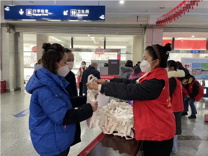 志愿者们身着红马甲,在现场为旅客们发放暖冬“福袋”:宣传文明实践的帆布包、镭射包、口罩、钥匙扣、便签本、卡包等,旅客们纷纷表示此次活动非常暖心。志愿者们还在现场为旅客们写下春联,一个个“福”字、一幅幅春联,承载了志愿者们对旅客们的美好新年祝福。收到春联的旅客们也表示非常开心,回家的旅程中将不再孤单。志愿者们积极为乘客们提供咨询引导、文明交通知识宣传、秩序维护等志愿服务,充分彰显了爱心善意和责任担当。