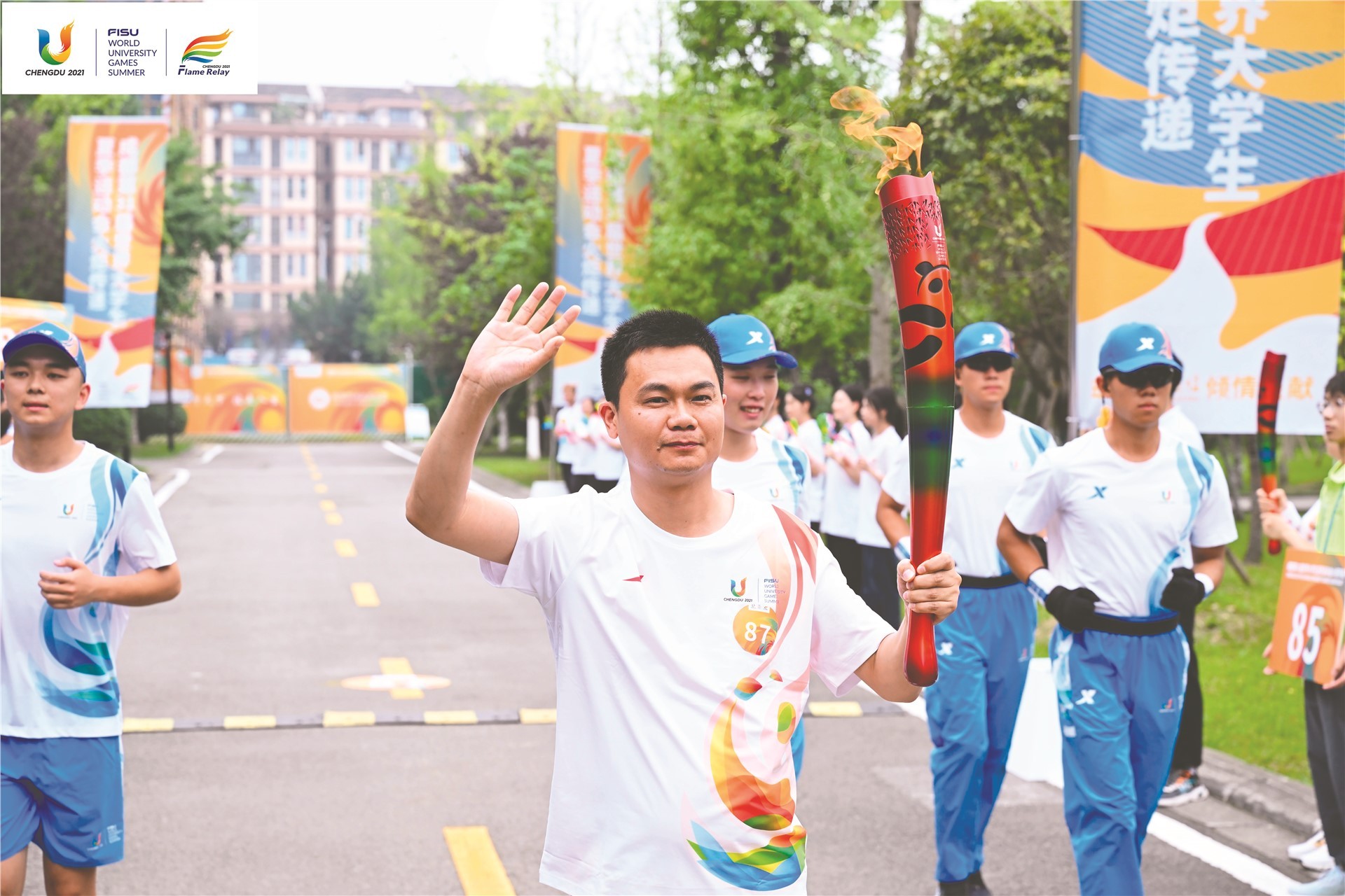 来自成都市郫都区的企业员工李准在成都职业技术学院活力亮相,担任成都大运会火炬传递成都站(首日)第87棒火炬手。