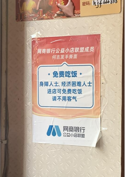 位于成都市青羊区双清南路的“何吉发手撕面”面馆,进门便可见一副醒目的字画:“乐莫乐于好善”,旁边的墙上贴着一张海报,清楚地写着:“身障人士、经济困难人士免费就餐”。
