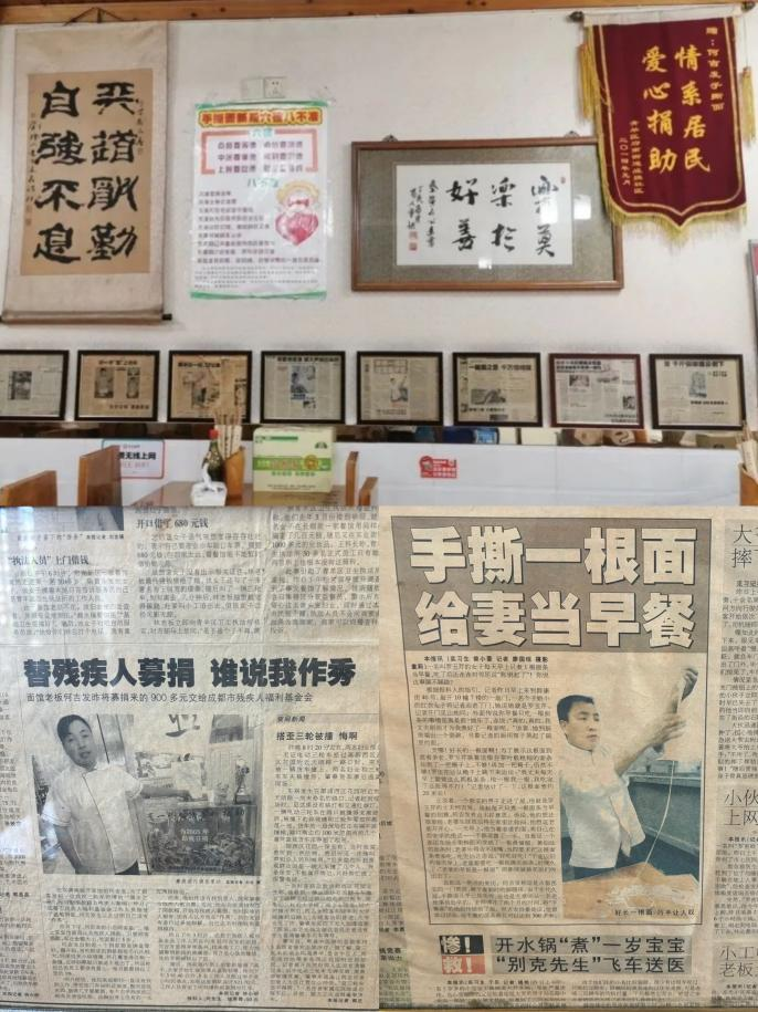 如今,何吉发的手撕面店已经做了23年的公益事业,帮助过的困难人士有上万名。他的故事被众多媒体报道,小店的墙上贴满了这些年来的剪报和锦旗。