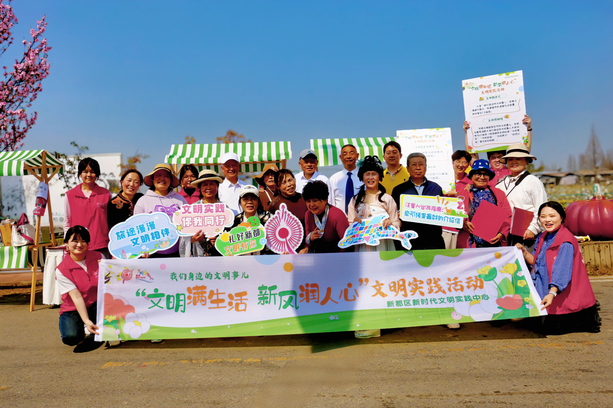 由新都区新时代文明实践中心精心布置的文明实践摊位以“文明出片”为创意核心,将拍摄文明行为与赏花游园相结合,让市民在踏春赏景中感受文明新风,践行文明行为。