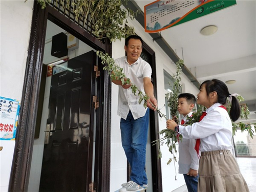 队员们和老师一起插艾叶 图片来源:湖心路小学