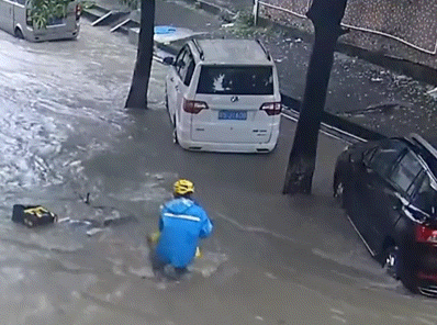 同样在清溪镇,不久前,一名黄衣外卖小哥在暴雨中被冲倒,眼看要被湍急的水流冲走,附近民警和一名蓝衣外卖小哥张建兴,见状立即赶过去救援,合力将黄衣小哥救起。同时,众人深知电动车对外卖行业的重要性,冒着被大水冲走的危险将电动车追回。