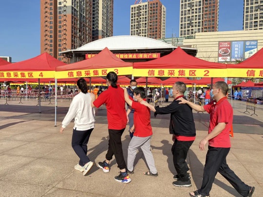 值得一提的是,在竹溪社区厚街广场核酸采样点,现场有一幕温暖的画面沁润人心:在绿色通道入口处,10多位视障人士正摸索着前进,他们有的手牵着手,有的行动不便拄着拐杖,现场工作人员见状,迅速上前搀扶,带领他们有序排队,一边充当他们的“眼睛”,一边提醒他们前面的路况,帮助他们高效完成核酸检测。“谢谢你们,虽然我们看不见。”面对工作人员的贴心举动,视障人士感激地说着,“采集速度非常快,彰显厚街速度和温度。”
