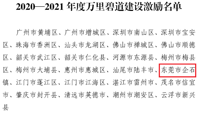 东莞万里碧道建设获得省河长办肯定。近日,广东省河长办公布2020-2021年度万里碧道建设激励名单,东莞市企石镇获得500万元奖励,这是东莞唯一获得碧道建设激励的单位。