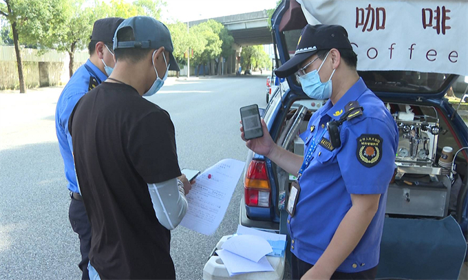在沙田镇体育南路发现一辆流动咖啡车在路边摆摊,工具箱和折叠椅更是占据人行道,沙田城管执法分局“小微执法”专项行动执法人员巡查发现后,立即取证、制作执法文书,依法对现场的流动商贩作出行政处罚,开启违法当事人现场手机扫码缴纳罚款的新型处罚模式。同时执法人员对流动商贩采取教育劝导与行政处罚相结合的方式,普及“小微违法行为”及相关处罚条例,并耐心劝导他们离开。