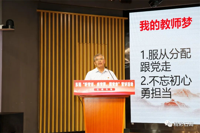 “党培养了我,我要坚守教育,为国家培养优秀人才。”石碣实验小学党支部书记、校长朱志权以《守正创新跟党走》为题,分享了他30多年来扎根教坛、坚守三尺讲台,见证石碣教育发展的喜人变化,展现教育工作者秉承教书育人的初心使命,为培养德智体美劳全面发展的社会主义建设者和接班人不懈努力。