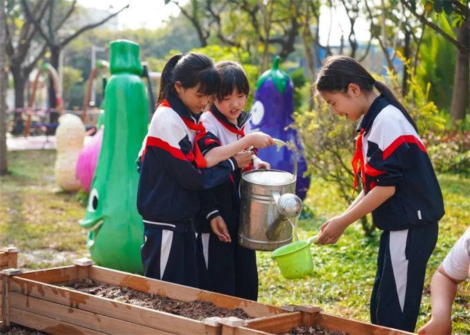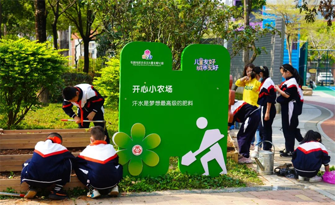 当天,微风和煦,阳光明媚,南城星河学校的学生如约来到石鼓社区儿童公园开心小农场,在德育老师的指导下,首先分配“承包地”,清除杂草、松土。老师还边为学生们讲解了植物的种植方式和生长特点。