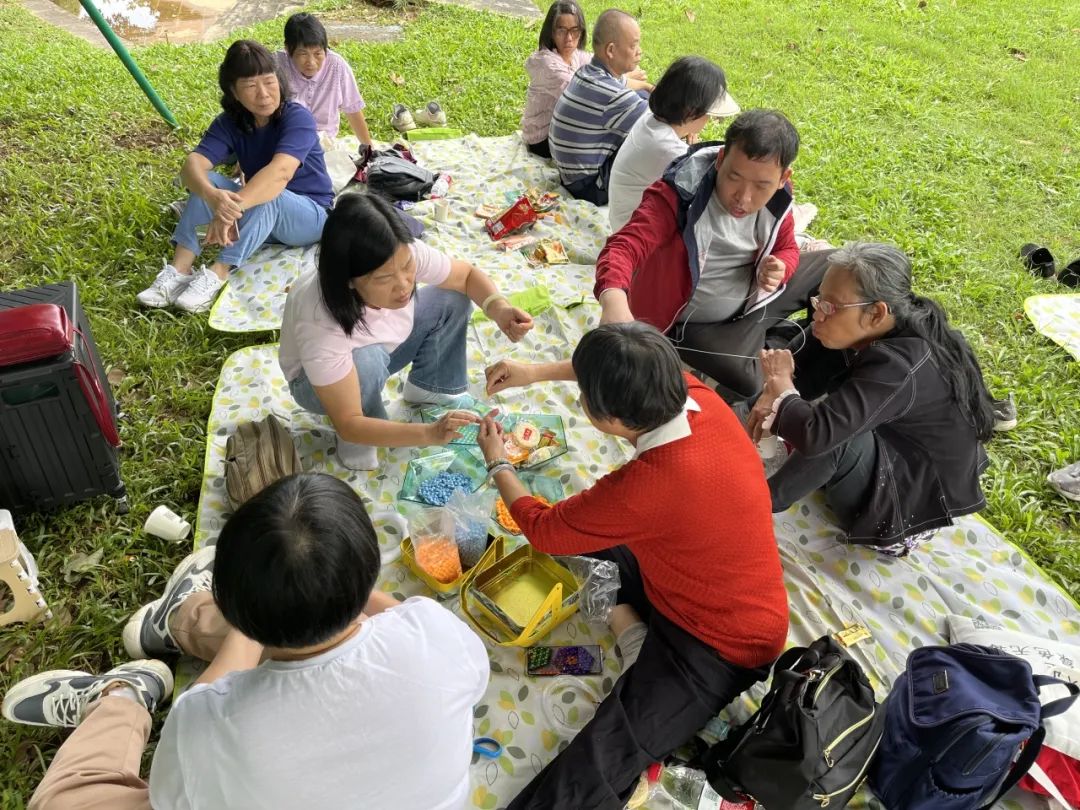 通过简单的自我介绍和破冰小游戏“桃花朵朵开”,参与活动的探访对象之间,探访对象与志愿者之间从初步认识到建立关系。大家坐在草地上,制作小手工,制作沙拉……吹着微凉的清风,闻着草地的自然清新气息,沐浴着秋日阳光,分享美食,分享生活趣事……如家人如朋友一样。