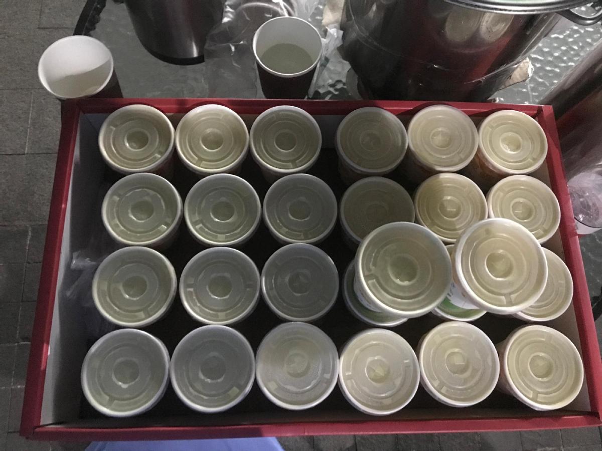 当晚7时许,李女士带着孩子抱着一大篮自制的杏仁露送到了志愿者的面前。“大家都辛苦了,赶紧趁热吃。”她热情的招呼大家。