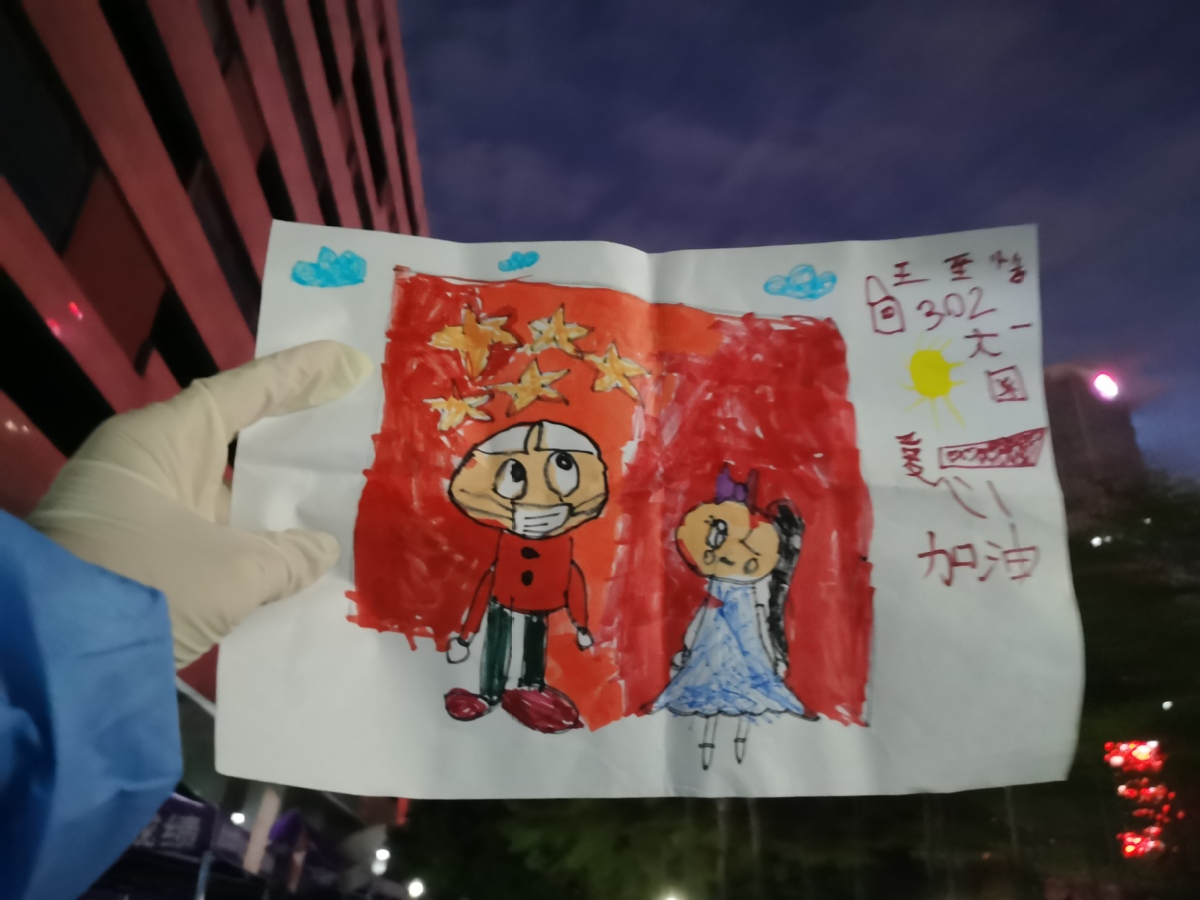 而在核酸检测点,还有一个热心小朋友在排队的时候,给维护秩序的志愿者送了一幅亲手画的画,给大家加油鼓劲。