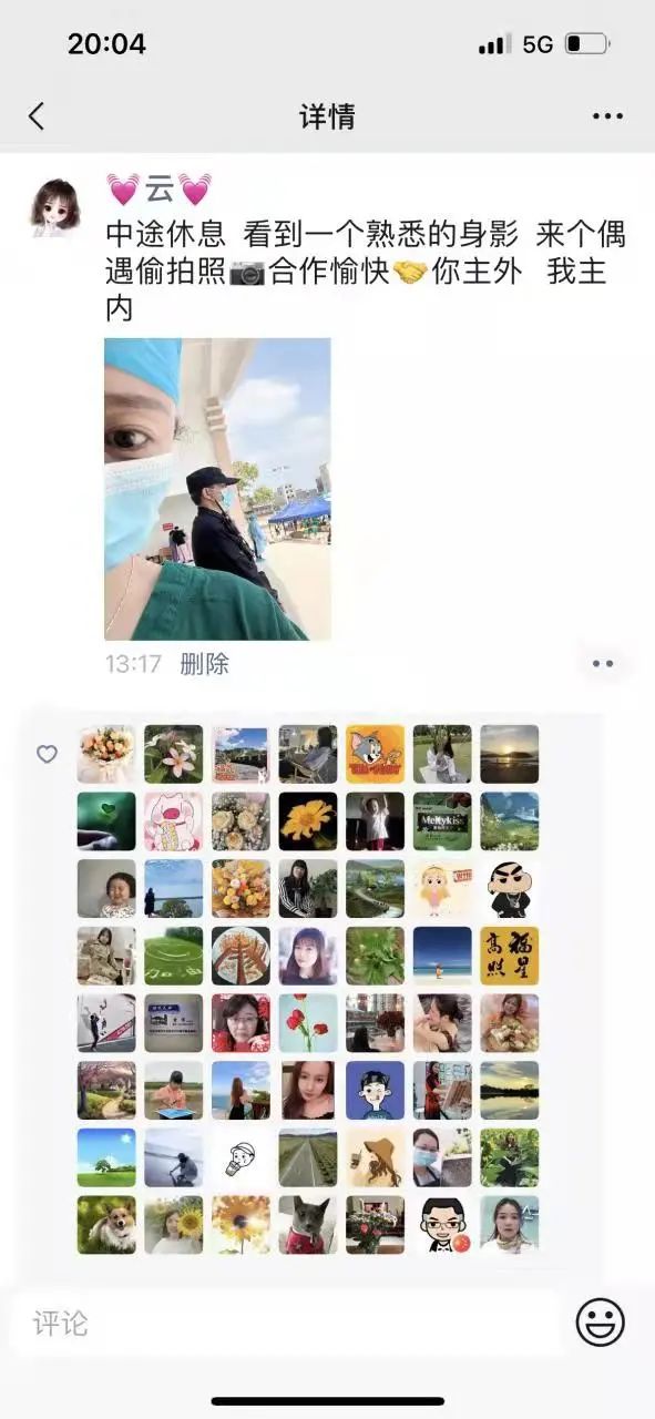 “中途休息,看到一个熟悉的身影,来个偶遇偷拍照,合作愉快。你主外,我主内。”“偷拍”得手的林丽云忍不住内心的甜蜜,午饭后她把“偷拍”的照片发到了朋友圈,向亲朋好友狠狠撒了一把“狗粮”。
