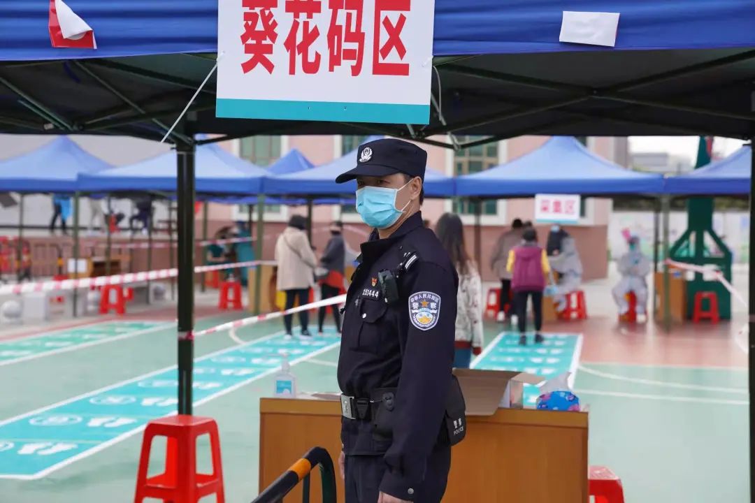 27日清晨,刘惠谦早早地来到了核酸检测执勤点,检查现场设施、安排人员岗位……9时,核酸检测工作正式开始,面对排队检测的市民,刘惠谦和队员们一起守护着检测点的安全,不时会用手中的小喇叭提醒着市民:请戴好口罩、请保持一米以上的距离、请有序排队……