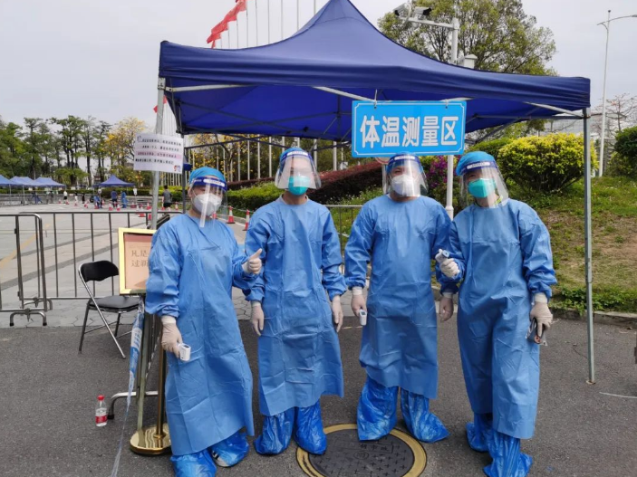 为了做好护服,志愿者都穿着密不透风的防护服,戴着橡胶手套、KN95口罩和塑料面屏,脚上还套着齐膝的塑料鞋套,白天气温在28—30度之间,站在骄阳下,很快就闷热得防护服里汗如雨下。跟我一起值守入口的还有市质检中心缪炯烨、东城应急分局袁卓添和松山湖城管分局陈敏雪三位志愿者,中午最炎热的五六个小时里,我们一直站着为大家测温、验码,旁边虽有椅子可以坐,但大家都不约而同地选择站着,就是想为每一位检测核酸的群众提供更快捷、更准确的服务和帮助。