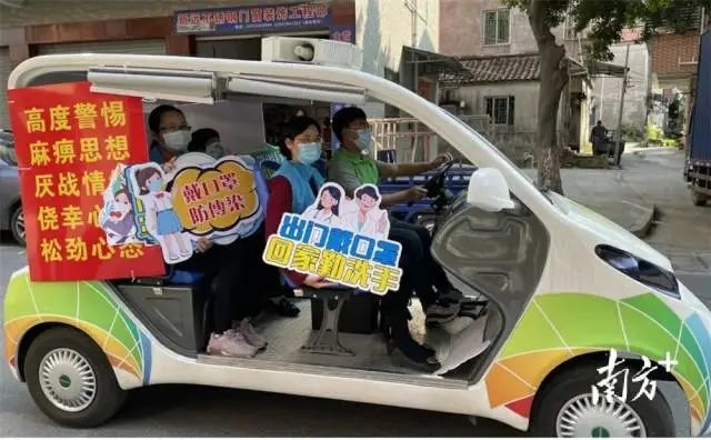 在本次劝导行动中,给人最直观的感受的就是“新”。移动喇叭、宣传车、摆摊设点、扮演卡通玩偶……各类花式宣传齐上阵。“我戴了口罩,你也戴了口罩,我们之间的感染率为1.5%……”在道滘、东城、麻涌等镇,志愿者们通过移动喇叭广播、LED屏巡逻车等方式全天循环播放防疫知识,用普通话和粤语提醒市民做好个人防护。