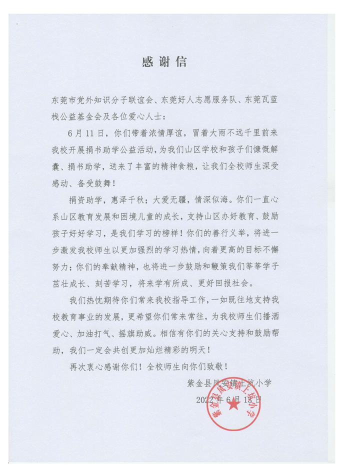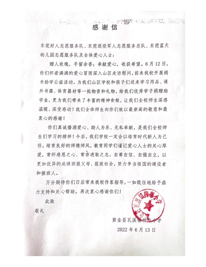 为更好地践行“我为群众办实事”实践活动,关心关爱农村困境儿童,助力他们健康快乐成长成材,6月11日至12日,东莞好人志愿服务队携手东莞市党外知识分子联谊会、东莞市退役军人军号志愿服务总队、东莞市瓦蓝栈公益基金会、东莞市蓝天幼儿园志愿服务队联合开展“爱心助学、传递希望”——河源紫金爱心公益行活动。