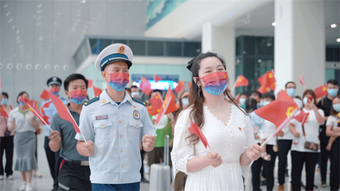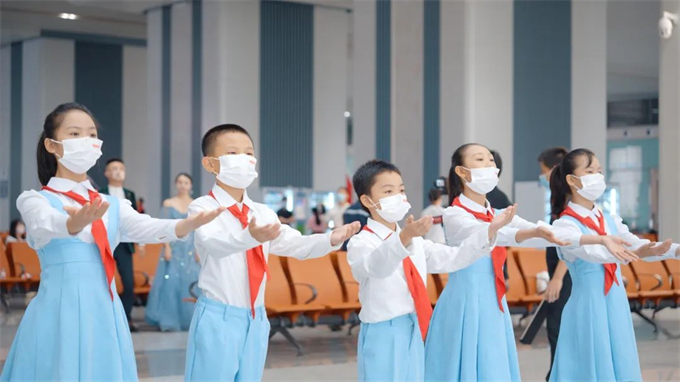少先队员用清澈的童声拉开了快闪活动帷幕,紧接着一首雄壮激扬的《没有共产党就没有新中国》响彻整个候车大厅。高铁站工作人员、政府机关干部、民警、消防员、教师、医护人员、快递小哥、企业员工、志愿者等各行各业党员代表纷纷加入到演出中,广大旅客也手舞红旗自动加入,大家一起用歌声诠释对党的挚爱和祖国的赞美。