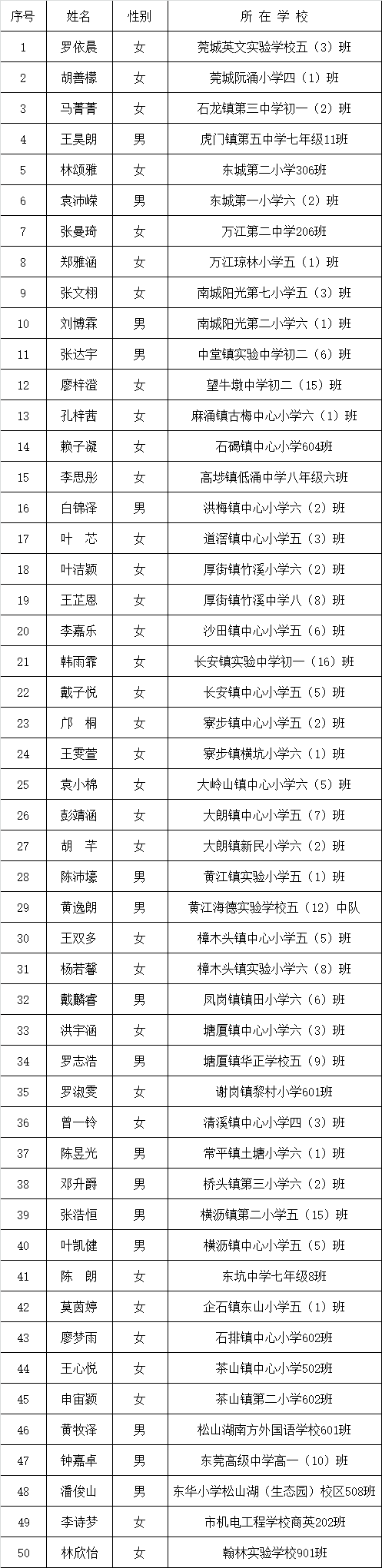 2022年东莞“新时代好少年”名单(排名不分先后)