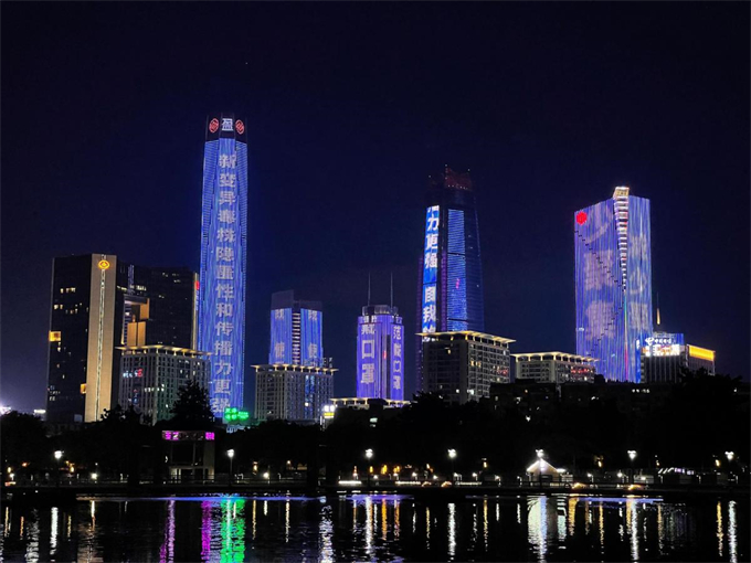 9月4日晚,民盈·国贸中心、东莞农商行大厦、环球经贸中心、嘉宏振兴大厦、东莞信息大厦等鸿福商圈楼体外墙纷纷亮灯,屏幕上一句句科学防疫标语滚动播放,提醒市民群众戴好口罩,提升疫情防控意识,呼吁市民为东莞的疫情防控贡献每个人的力量。