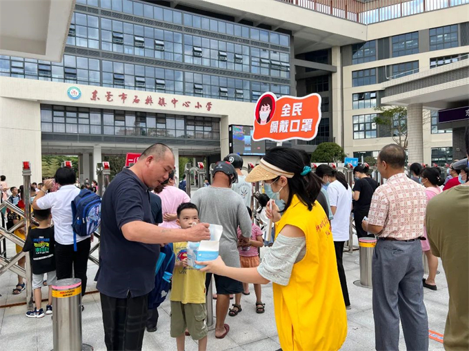 市镇两级媒体开展正确戴口罩、科学规范戴口罩宣传;各镇街志愿者走上街头,向市民群众免费发放口罩,呼吁市民戴口罩;东莞地标建筑滚动播放科学防疫标语,提醒市民群众科学防疫……