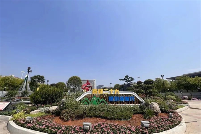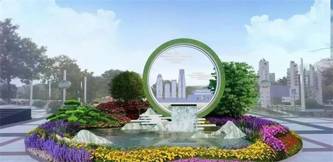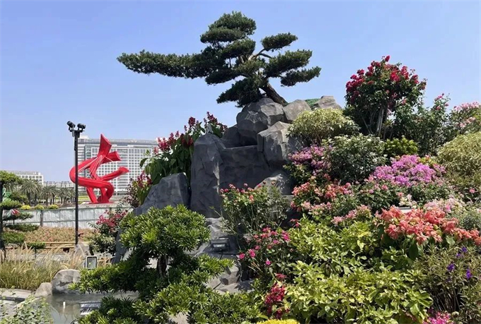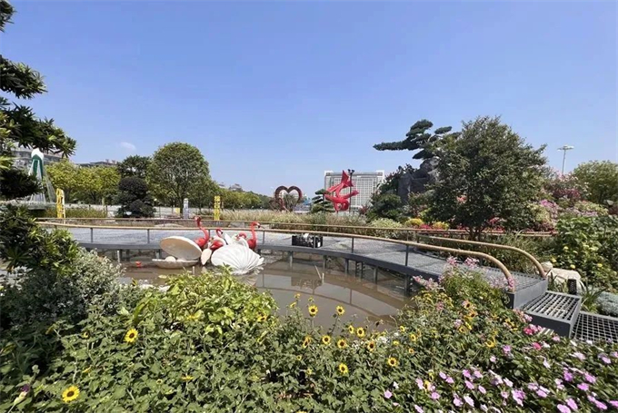 而另外一侧,南广场花坛宽约18米,高约6米,占地面积约254平方米,花园式园林景观与东莞城市代表性建筑剪影相融合,传递大湾区高品质现代化都市深度融合、共生共荣的发展理念。